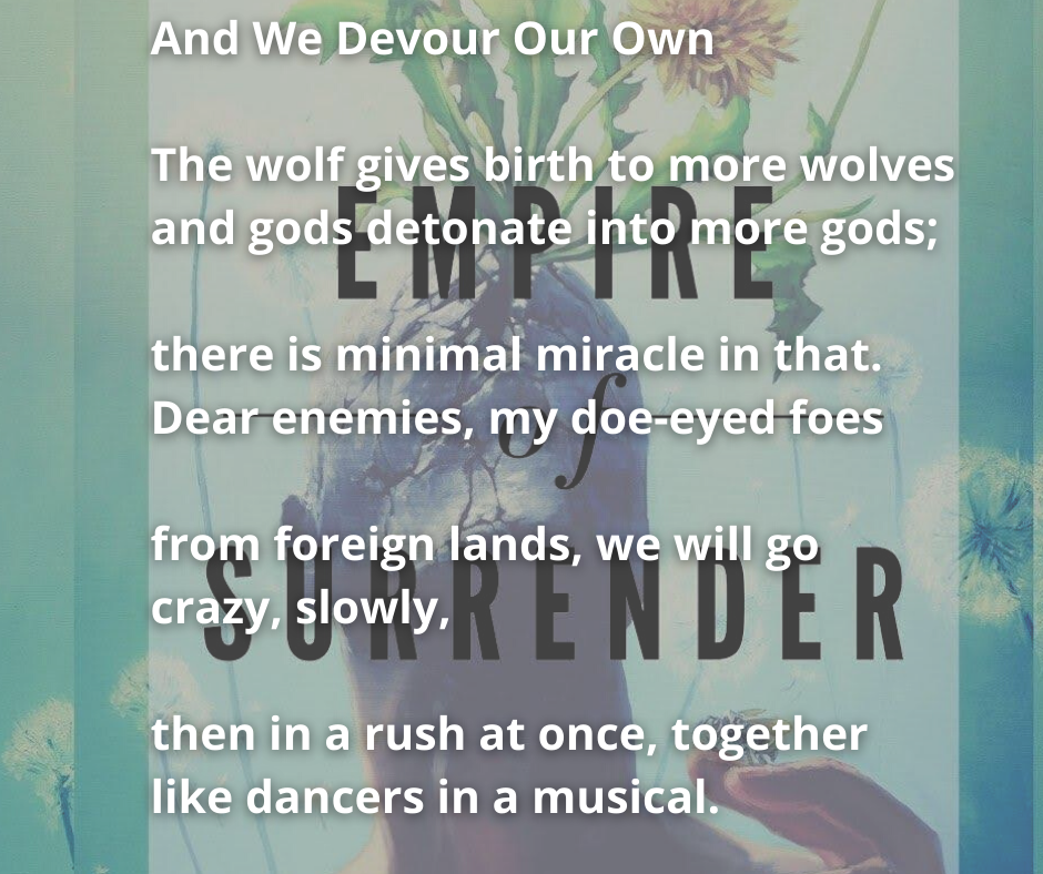 November 20, 2021 Michael Schmeltzer Empire of Wolves Excerpt from the poem “And We Devour Our Own” from my forthcoming book Empire of Surrender. Share this: Click to share on X (Opens in new window) X Click to share on Facebook (Opens in new window) Facebook Like Loading... Related